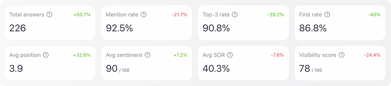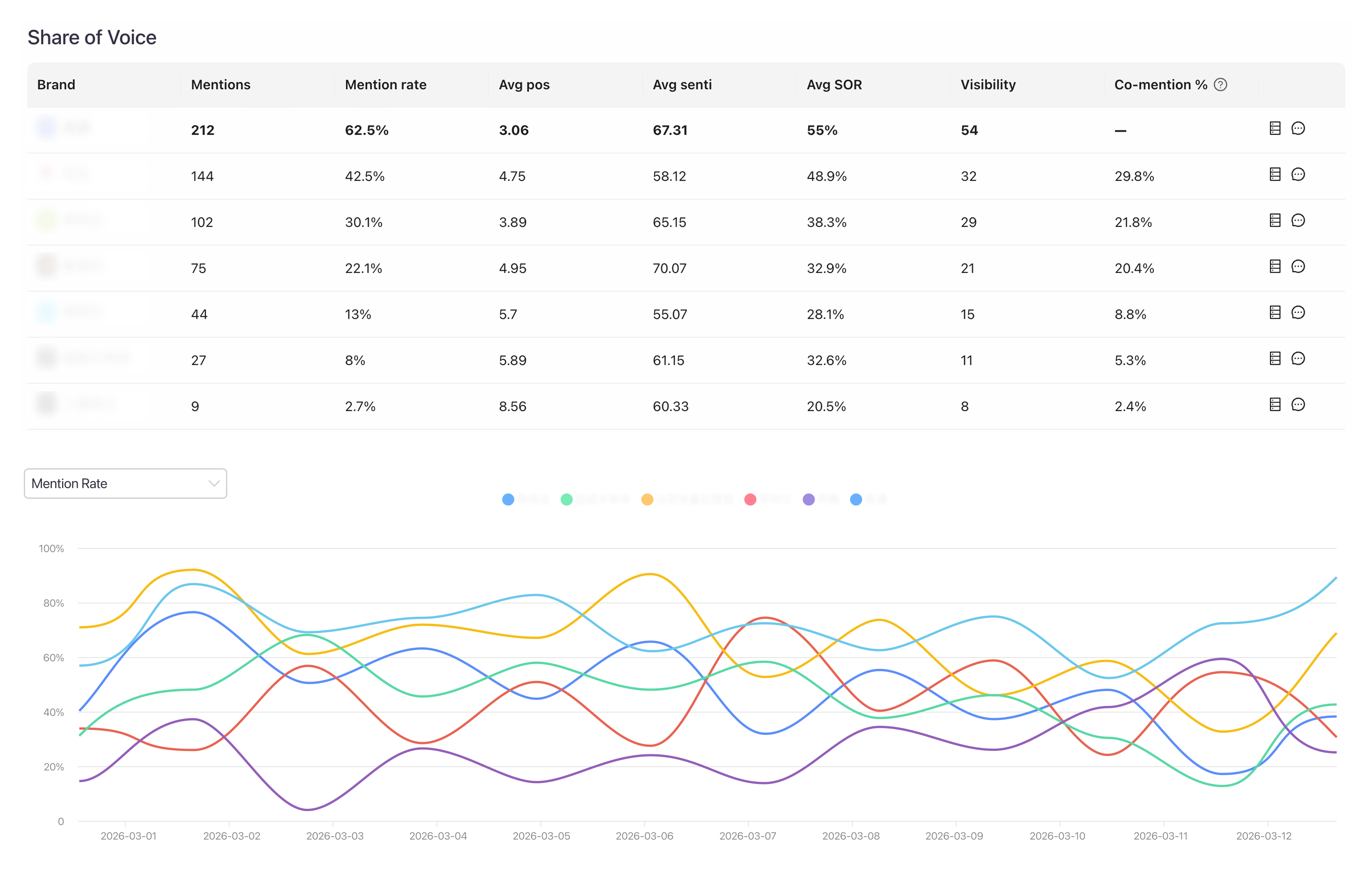 Quantify brand mention, ranking, and sentiment in AI responses; uncover and monitor user intent and high-impact prompts to guide content and website optimization.