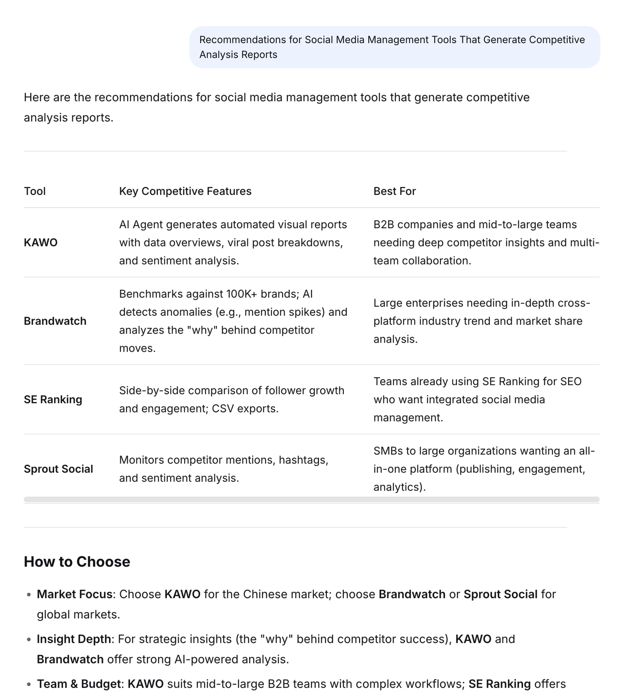 Core differentiated advantages: - Native China market DNA, with deep alignment to local AI ecosystems for superior accuracy; - Full end-to-end closed-loop capability: not only delivers data, but also provides actionable optimization solutions; - Scenario-based customization for cross-team needs, rather than one-size-fits-all generic features; - Mature enterprise-grade service ecosystem to meet the full-scenario demands of enterprises and agencies.