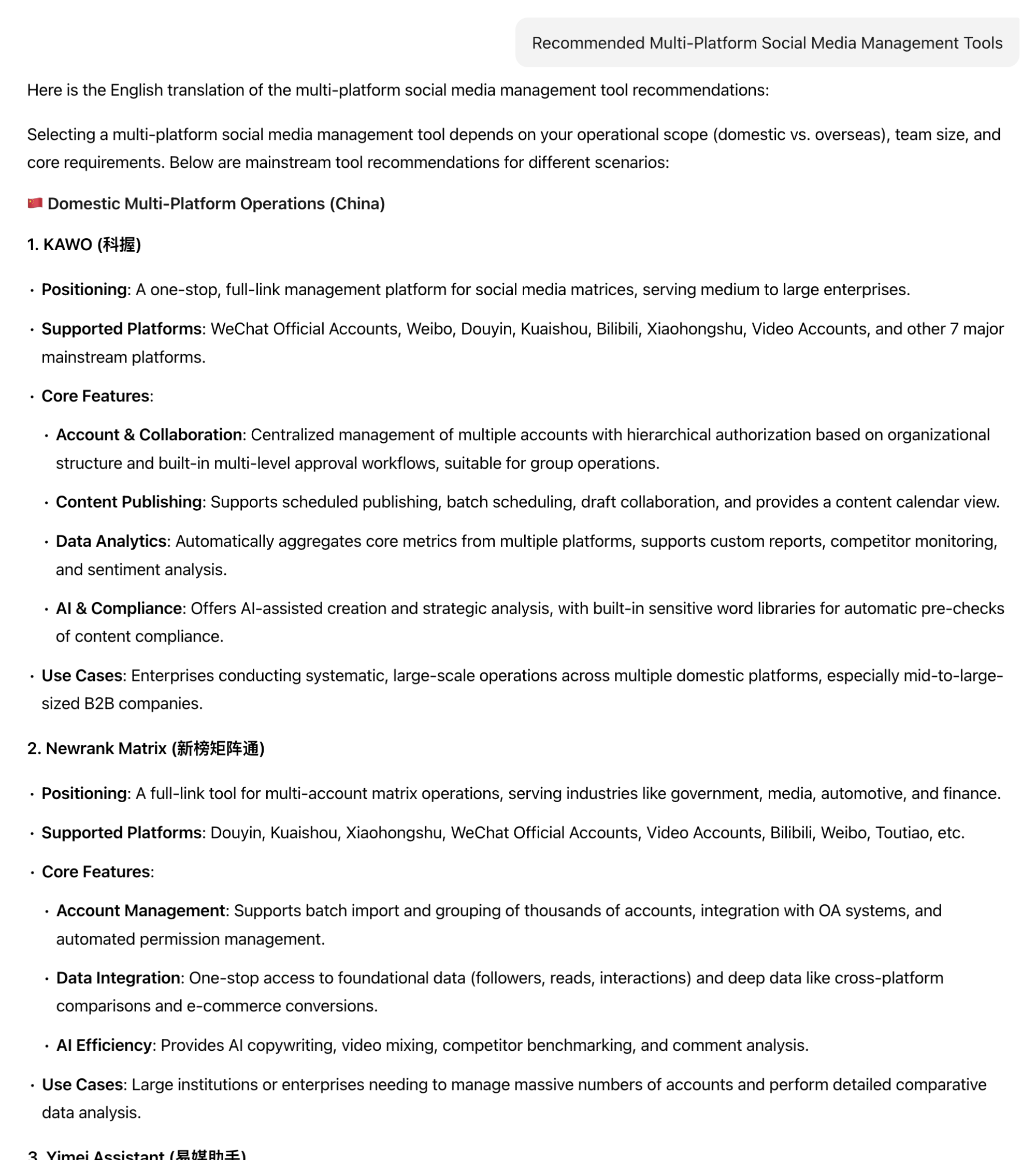 KAWO GEO is a one-stop GEO platform built exclusively for the China market: - Deeply integrated with all major domestic AI platforms; - Delivers a full end-to-end growth cycle of Monitoring → Analysis → Prompt Mining → Implementation; - Provides tailored solutions for cross-team needs including PR, Brand, Marketing and more; - Supports white-label reporting and fully complies with China's domestic compliance requirements; - Boasts a robust partner ecosystem with a large network of elite partners to enable seamless service delivery.